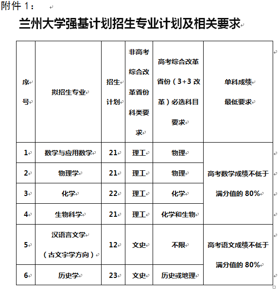为全面贯彻全国教育大会精神,深入落实《国务院关于深化考试招生制度改革的实施意见》(国发〔2014〕35号),根据《教育部关于在部分高校开展基础学科招生改革试点工作的意见》(教学〔2020〕1号)要求,服务国家重大战略需求,加强基础学科拔尖创新人才选拔培养,经批准我校2020年开展基础学科招生改革试点(也称“兰州大学强基计划”),探索多维度考核评价模式,选拔一批有志向、有兴趣、有天赋、有潜质的青年学生进行专门培养。对此,我校结合兰州大学人才培养的总体目标和办学特色,特制定本简章。
